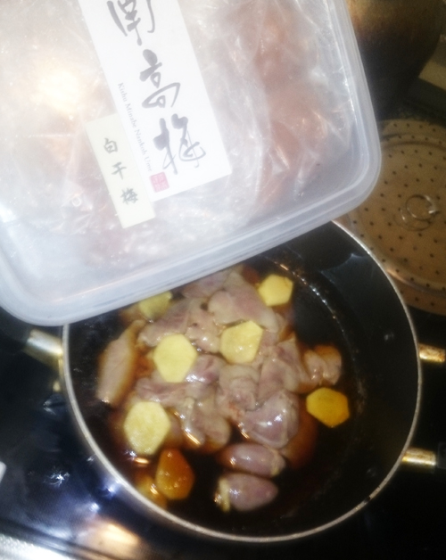 そして、煮汁、生姜と、梅干しを入れます