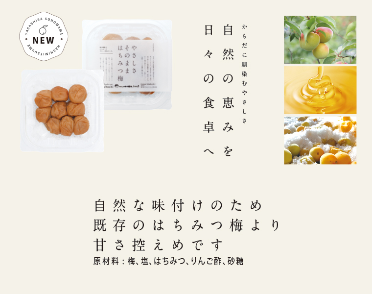 ![]() 南高梅を、塩・はちみつ・りんご酢・砂糖のみで丁寧に仕込みました。化学調味料には頼らず、素材の持ち味を第一に考えて生まれた、ぷらむ工房こだわりのやさしいはちみつ梅です。梅の酸味を、はちみつの自然な甘さが包み込み、口あたりはまろやかで、後味すっきり。毎日の食事や、ほっと一息つきたいときにも、静かに楽しんでいただける一品です。
