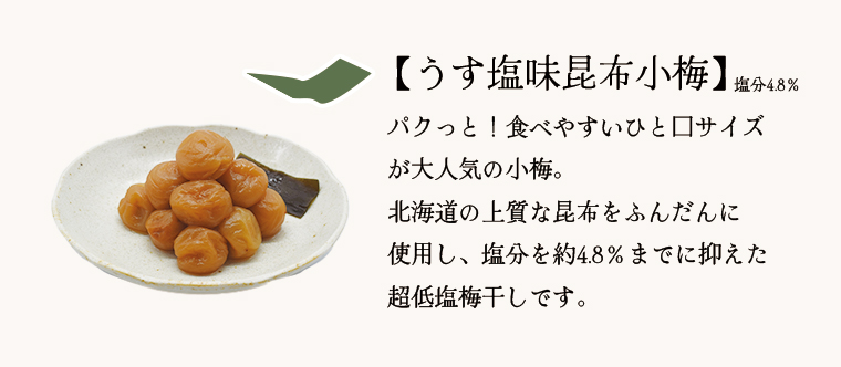 ■うす塩味昆布小梅:【小梅、漬け原材料〔果糖ぶどう糖液糖、食塩、発酵調味料、昆布調味エキス、醸造酢、たん白加水分解物〕/酒精、調味料(アミノ酸等)、酸味料、ユッカ抽出物、ビタミンB1、甘味料(スクラロース) 】