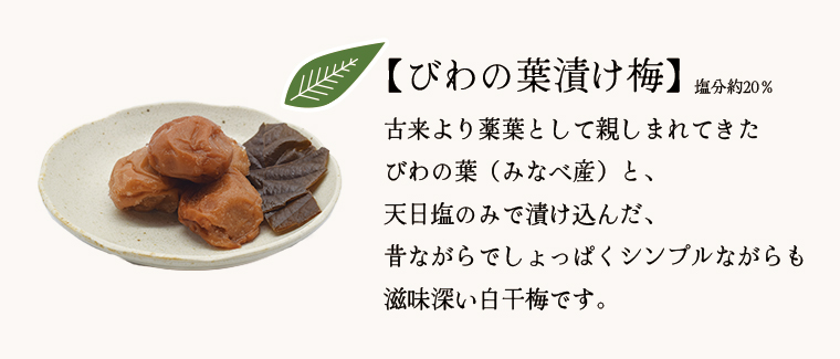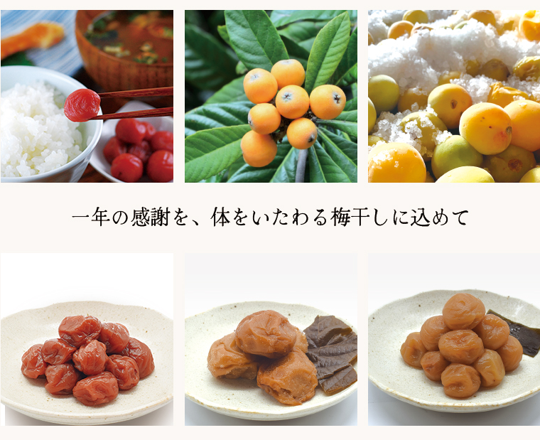 ![]() 新商品の「びわの葉漬け梅」、そして「うす塩味昆布小梅」、「しそ漬うす塩味小梅」の3種の味をセットした、冬のからだを整える三段重の梅干しギフトをご用意しました。