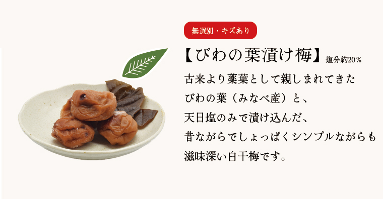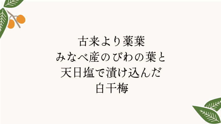 古来より薬葉として親しまれてきたびわの葉(みなべ産)と、天日塩のみで漬け込んだ、昔ながらでしょっぱくシンプルながらも滋味深い白干梅です。