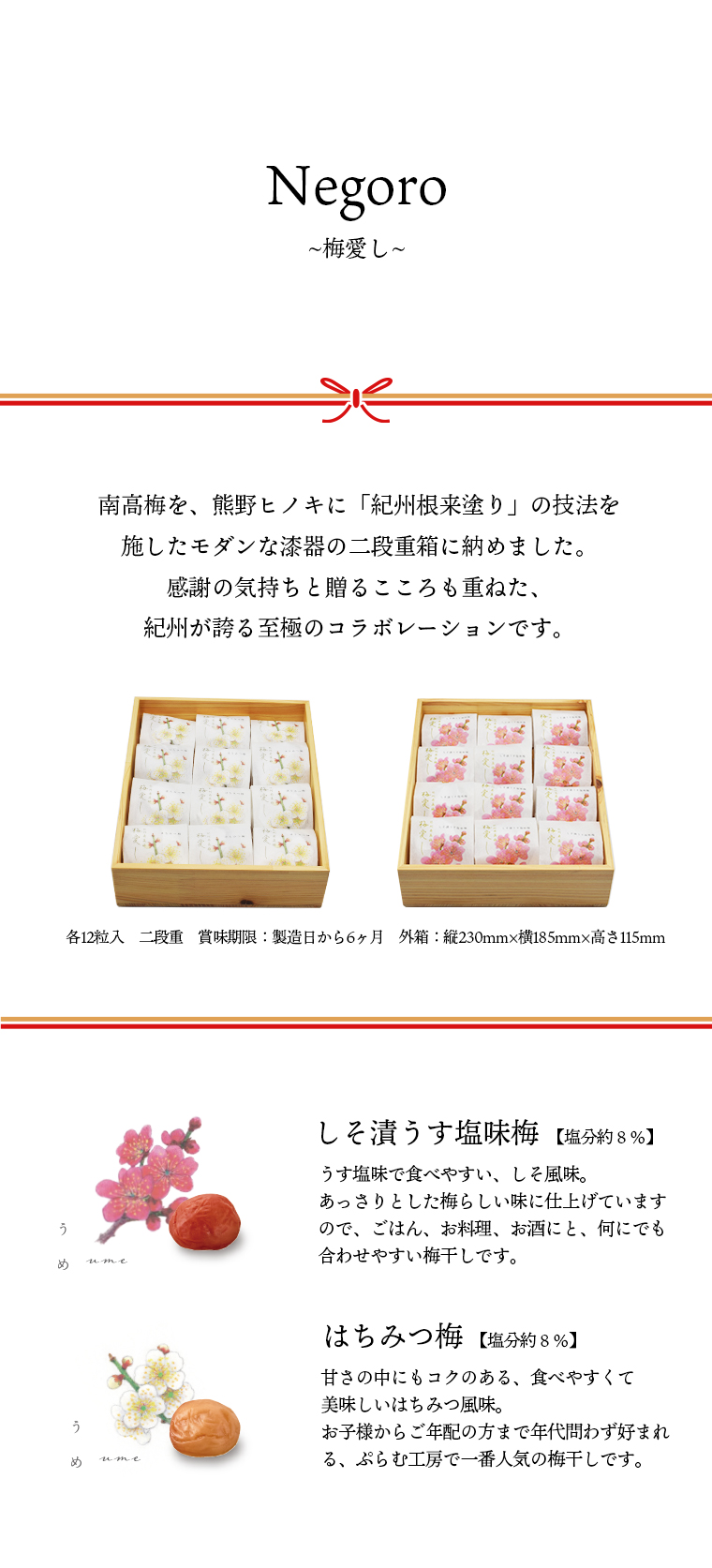 ![]() 南高梅を、熊野ヒノキに「紀州根来塗り」の技法を施したモダンな漆器の二段重に収めました。感謝の気持ちと贈るこころも重ねた、紀州が誇る至極のコラボレーションです。
