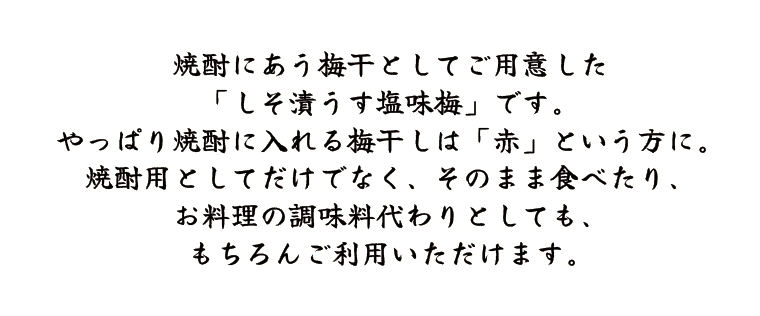 ![]() 焼酎にあう梅干としてご用意した「しそ漬うす塩味梅」です。やっぱり焼酎に入れる梅干しは「赤」という方に。焼酎用としてだけでなく、そのまま食べたり、お料理の調味料代わりとしても、もちろんご利用いただけます。